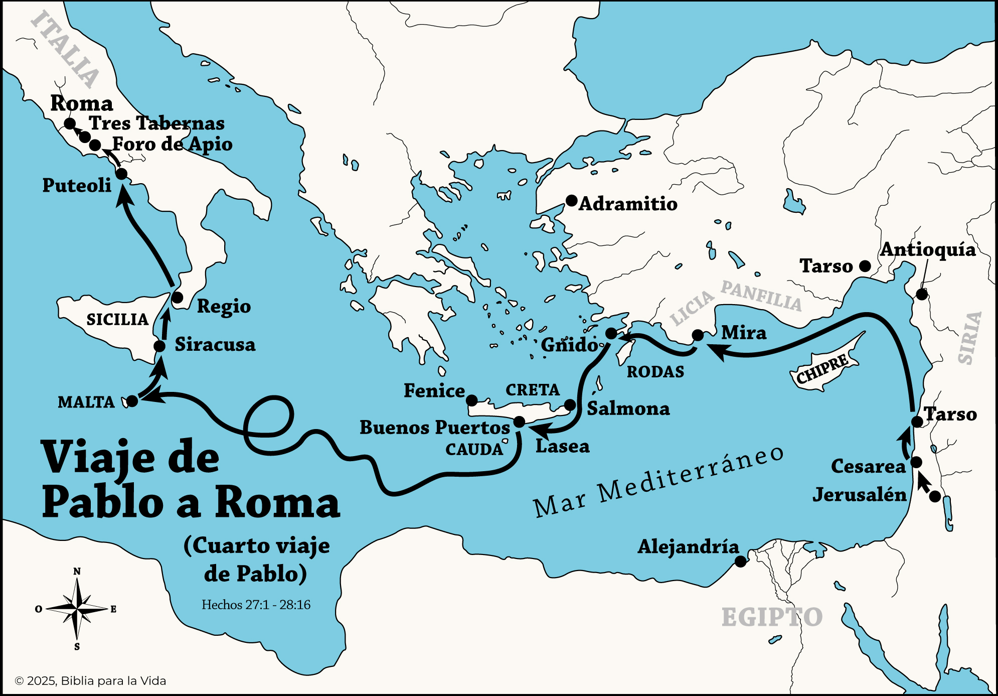 El mapa del viaje de Pablo a Roma te será de mucha utilidad para estudiar Hechos de los Apóstoles, ubicando los diferentes lugares del trayecto y teniendo una mejor apreciación de las distancias.