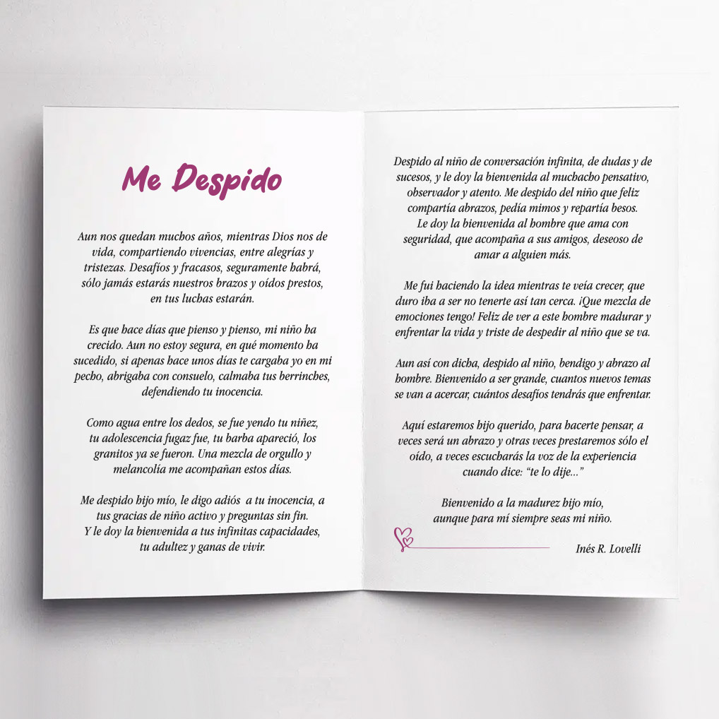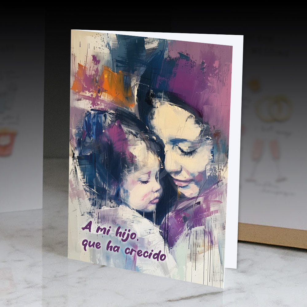Tarjeta «A mi Hijo que ha crecido», ideal para regalar a tu hijo, que ya creció, con un hermoso diseño de portada y una bellísima poesía alusiva en su interior. Consúltanos sobre descuentos por cantidad.